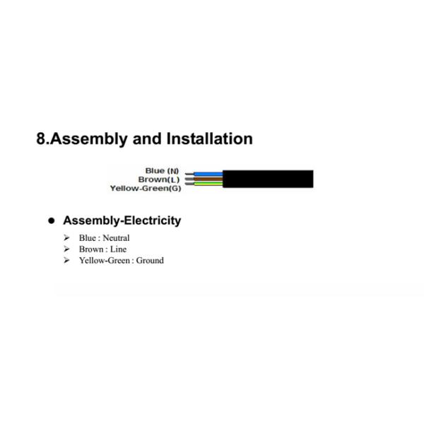 | Wire connection | L(Brown);N(Blue);G(Green/Yellow) |